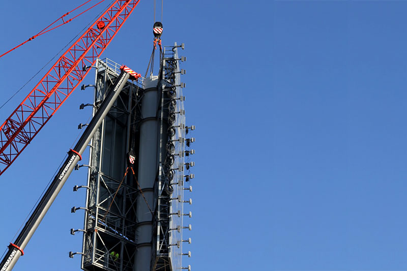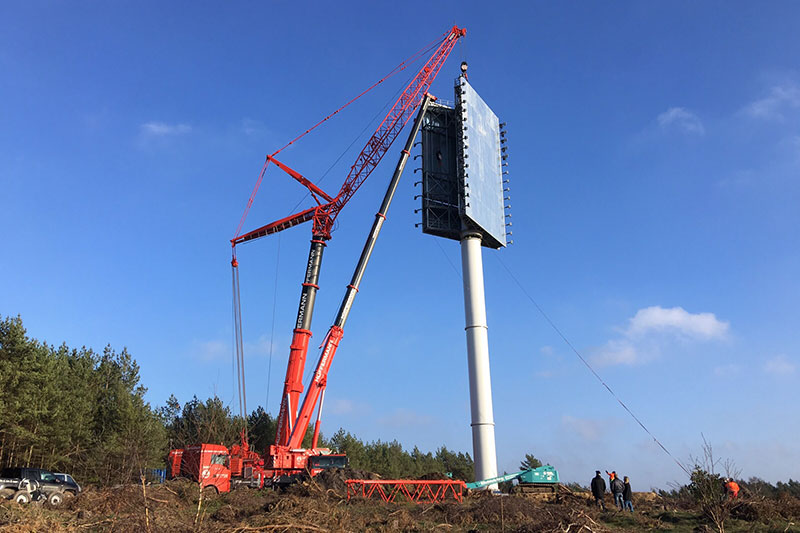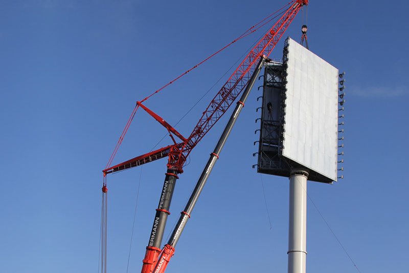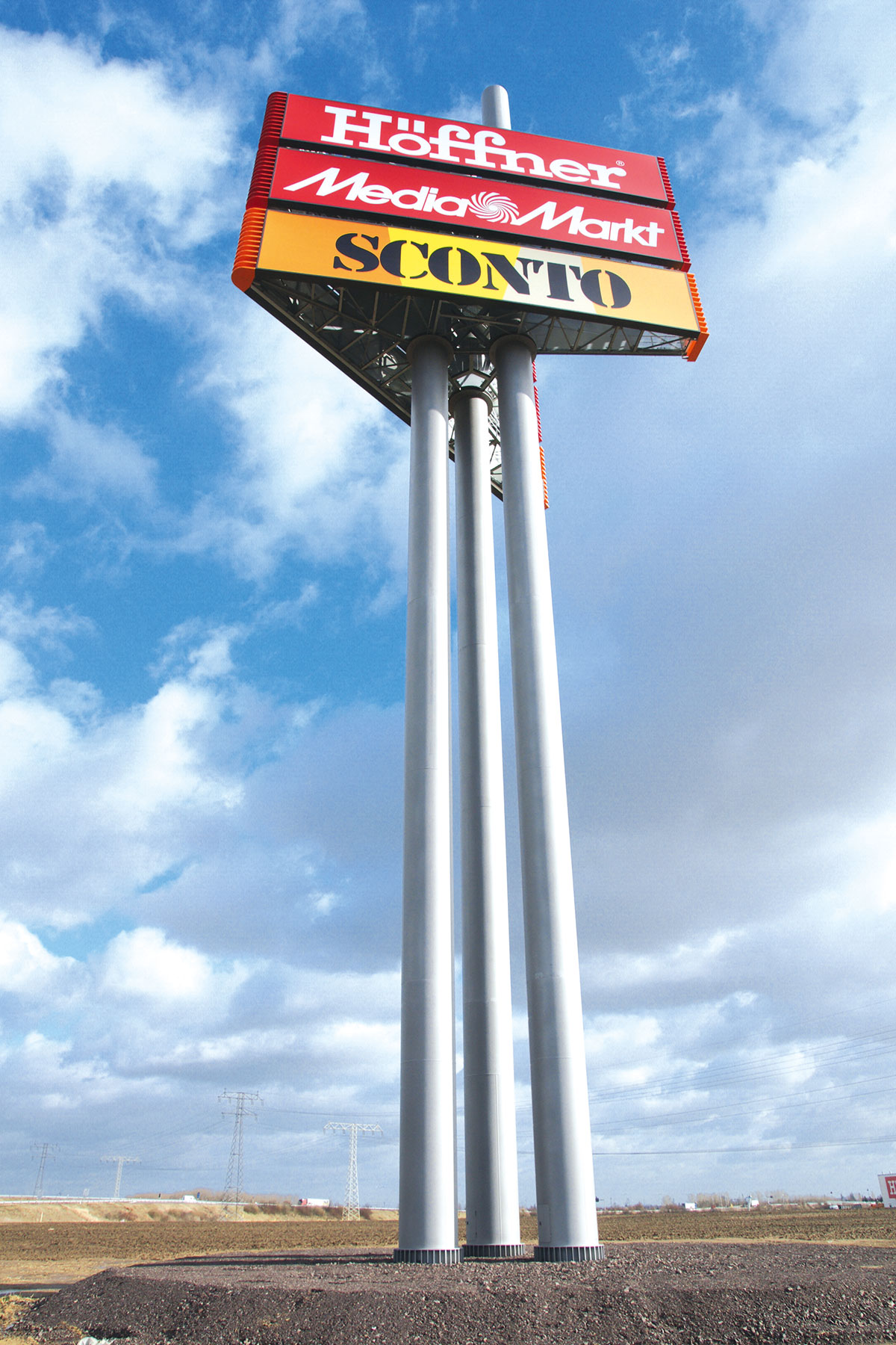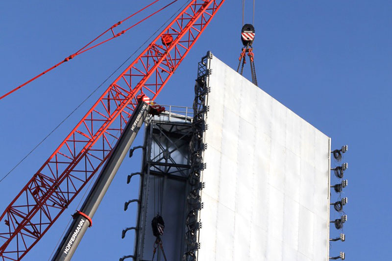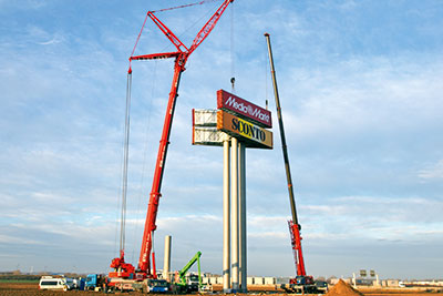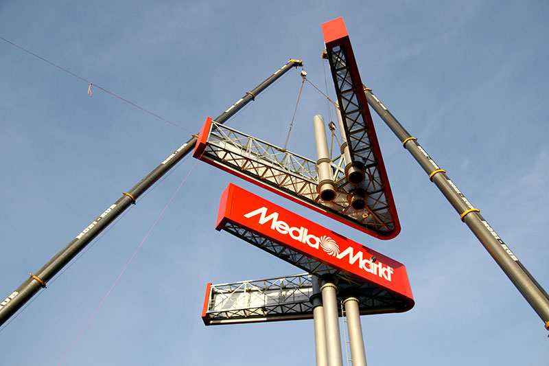 Im November 2015 errichteten wir einen neuen großen Werbeturm für das Designer Factory Outlet Center (FOC) in Soltau. Hierbei handelt es sich um einen einstieligen Werbepylon mit 45 Metern Nennhöhe und zwei Werbeflächen à 17 x 10 Metern, die im 30°-Winkel angeordnet sind, für eine optimale Sichtbarkeit und Kundenwirksamkeit. Von der Konstruktion des ca. 140 Tonnen schweren Bauwerks bis zur Übergabe an den Kunden vergingen nur wenige Monate, der gegebene Zeitplan wurde von SSG wieder einmal vollständig eingehalten.